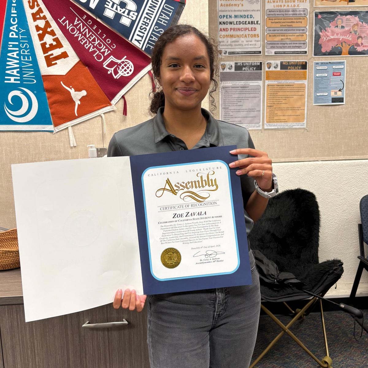 San Jacinto Leadership Academy student Zoe Zavala was honored as a California State Student Author during a special celebration hosted by the California Department of Education on April 6 in Sacramento. Zoe joined a select group of student writers from across the state, sharing an excerpt of her published work and highlighting the importance of literacy, storytelling, and student voice.