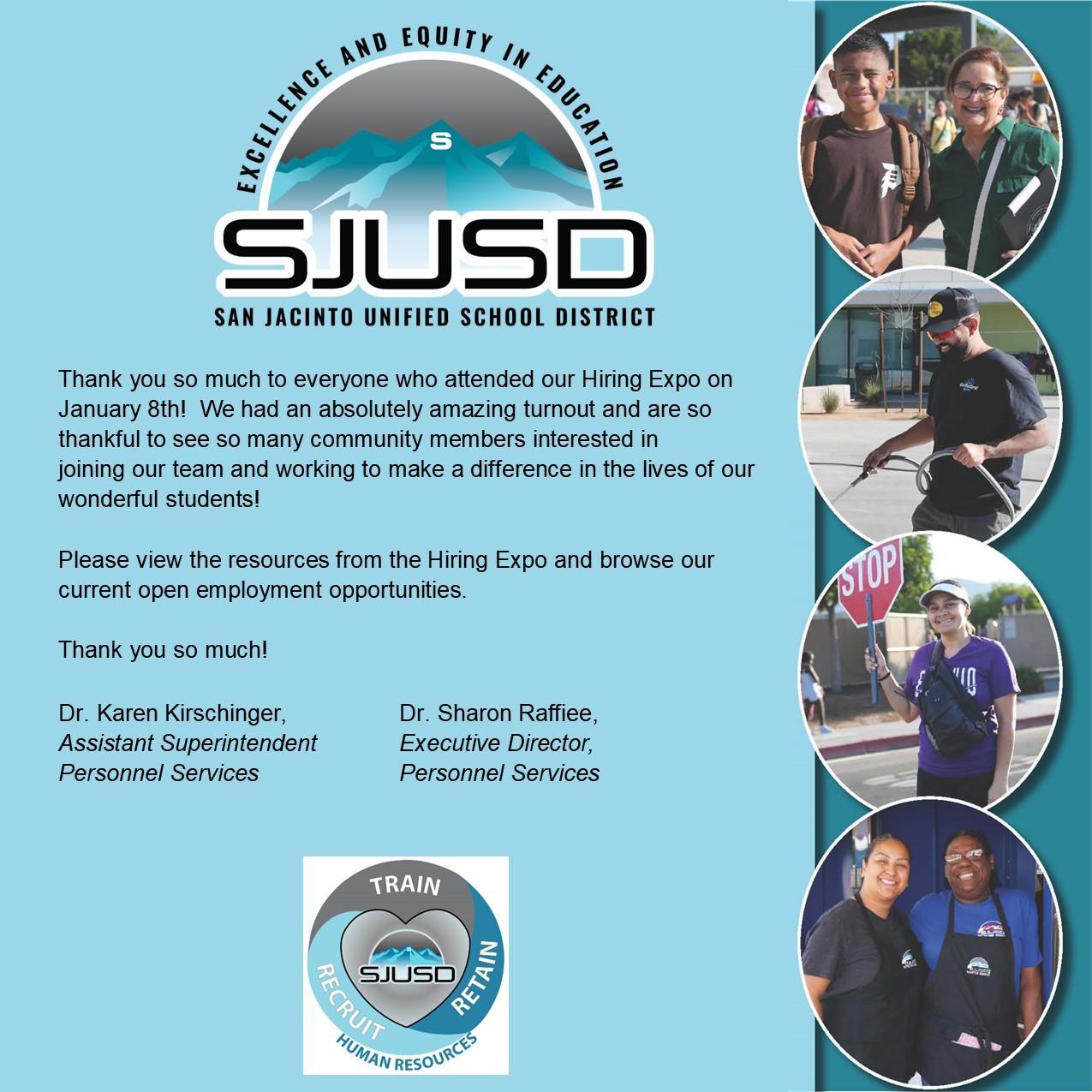 The Human Resources Department will support the mission of the San Jacinto Unified School District by recruiting, training and retaining caring, highly-qualified, exceptional employees to serve the students and families of San Jacinto.